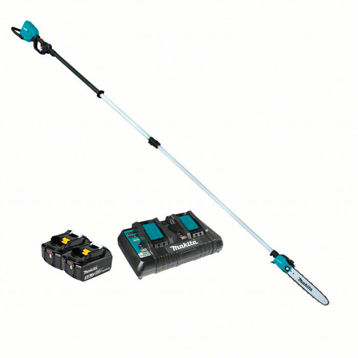 La Motosierra con Vara Telescópica Inalámbrica de 30 cm (12") y 18V X2 (36V) LXT BL AFT de Makita, ideal para podar y desramar árboles altos o áreas de difícil acceso, con un motor BL de alta potencia que entrega una eficiencia de operación igual o superior a los modelos a motor de la clase 30 mL. La velocidad de la cadena es igual o superior a la de los modelos de la competencia, permitiendo un corte cómodo. El cabezal ligero de la sierra de pértiga facilita el acceso a la posición de corte deseada y reduce la fatiga del operador. El tubo de extensión telescópico es ajustable en longitud de 2.5 m a 3.8 m, proporcionando un alcance extendido.