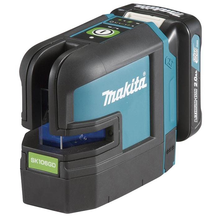 El Láser de Línea Cruzada/4 Puntos Autonivelante de Haz Verde CXT® de 12V max de Li-Ion (SK106GDZ) Makita le da al usuario una solución inalámbrica para líneas de referencia cruzada horizontales/verticales seleccionables más los 4 puntos requeridos para aplicaciones de nivelación, alineación, aplomado y escuadra. El SK106GDZ tiene un láser verde brillante de clase II de 525 nm con +/-1/8” a 33’ (aprox. +/- 3mm a 10m) para una precisión líder en su clase. Para mayor eficiencia, la estabilidad de la línea de autonivelación se logra en hasta 3 segundos para una mayor productividad.