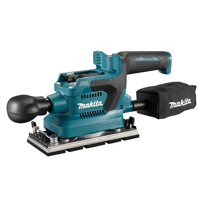 Lijadora Orbital Inalámbrica de 1/3 de Hoja y 18V BL de Makita con Sistema de Extracción de Polvo Integrado. Tanto el motor como la batería están ubicados sobre la superficie de lijado para suprimir la vibración de la base, permitiendo proporcionar una superficie con acabado uniforme. La movilidad inalámbrica permite una operación fluida sin preocuparse por el manejo del cable y la empuñadura frontal es desmontable sin herramientas para el lijado de esquinas.