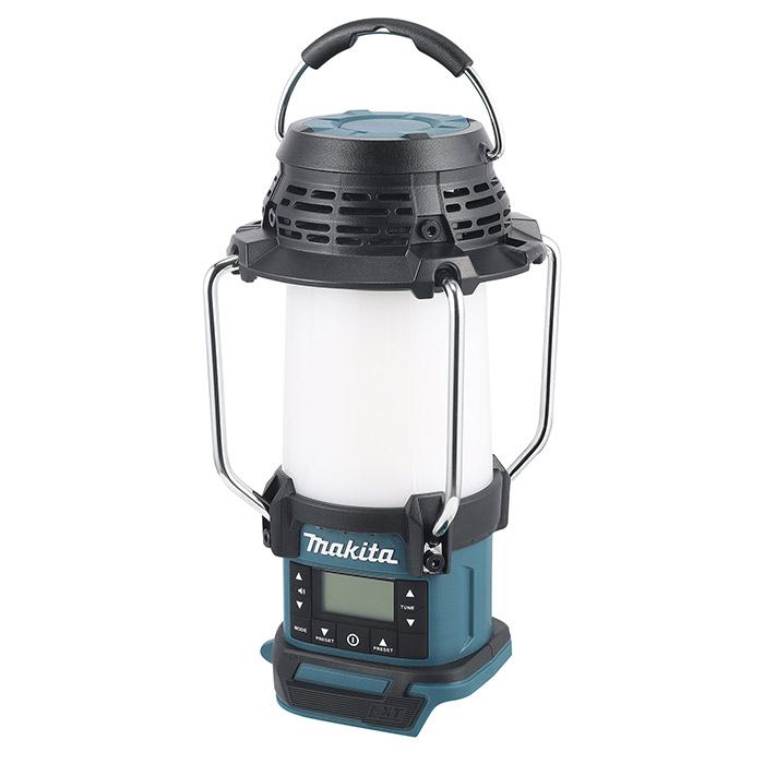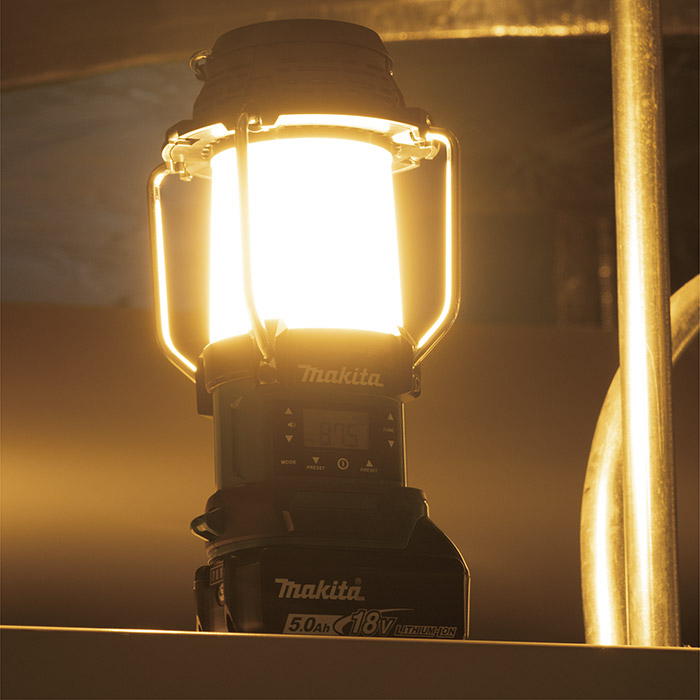 La Radio con Lámpara Inalámbrica de 18V LXT de Makita, equipada con función de memoria que recuerda los ajustes de brillo y tono de luz de la última vez que se apagó, gancho para colgar plegable y correa con gancho que permite iluminar hacia abajo, y pantalla digital LCD para la frecuencia de la estación de radio y la selección del nivel de volumen.