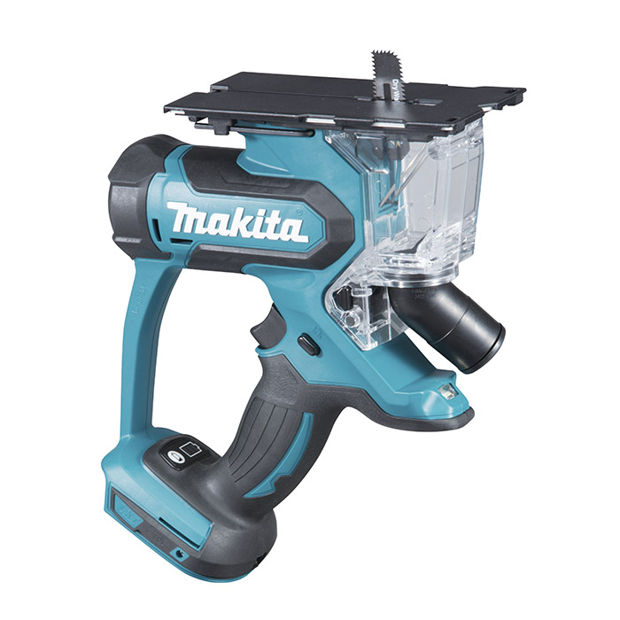La Sierra para Drywall Inalámbrica de 18V LXT Li-Ion de Makita. Ideal para hacer agujeros en drywall al instalar luces de techo, rejillas de ventilación, etc. Caja de polvo diseñada para atrapar el polvo en aplicaciones sobre la cabeza para un trabajo cómodo. Se logra un corte recto fácil gracias a la forma de la hoja y al sistema de corte. El control de velocidad variable por gatillo permite un inicio de corte más fácil. Compatible tanto con las hojas especiales para esta sierra para drywall como con las cuchillas de corte segmentado . La cubierta de la base y de la hoja protegen las superficies de drywall de daños/rasguños. La caja de polvo conectable a aspiradoras también está disponible como accesorio opcional. La luz de trabajo LED doble ilumina brillantemente la línea de corte para un corte fácil en lugares oscuros. Función de bloqueo del gatillo para operación continua. El indicador de nivel de batería muestra el estado de carga.