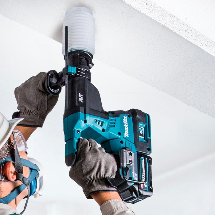 Rotomartillo Combinado Inalámbrico BL XGT de 40Vmax, 28 mm (1-1/8"), SDS-PLUS Makita. Alta potencia similar a la serie DHR282, excelente balance de la herramienta para un fácil manejo y Tecnología Anti-Vibración (AVT) para una vibración extremadamente baja. Operación de 3 modos para "Solo Rotación", "Martilleo con Rotación" o "Solo Martilleo". El mandril deslizable de un toque permite cambios de broca rápidos y fáciles, con un limitador de Torque que detiene la rotación si la broca se atasca para mayor seguridad del operador y mejor protección del motor.