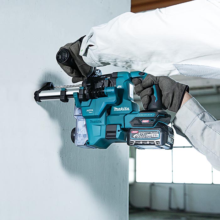 El Kit de Rotomartillo AVT® Inalámbrico sin Escobillas (Brushless) XGT® de 40V max, 13/16", SDS-PLUS con Extractor de Polvo, AFT® y Compatible con AWS® es una solución inalámbrica para concreto diseñada para aplicaciones de carga pesada. Entrega la potencia, velocidad y tiempo de ejecución de las herramientas con cable,pero sin necesidad de utilizarlo. El HR010 es impulsado por una batería XGT® de 40V max (se vende por separado) y un motor sin escobillas construido por Makita que se combinan para entregar la potencia y el rendimiento requeridos para aplicaciones de carga pesada. Puede entregar hasta un 40% más de fuerza de golpeo*.