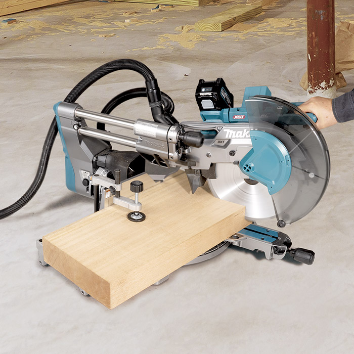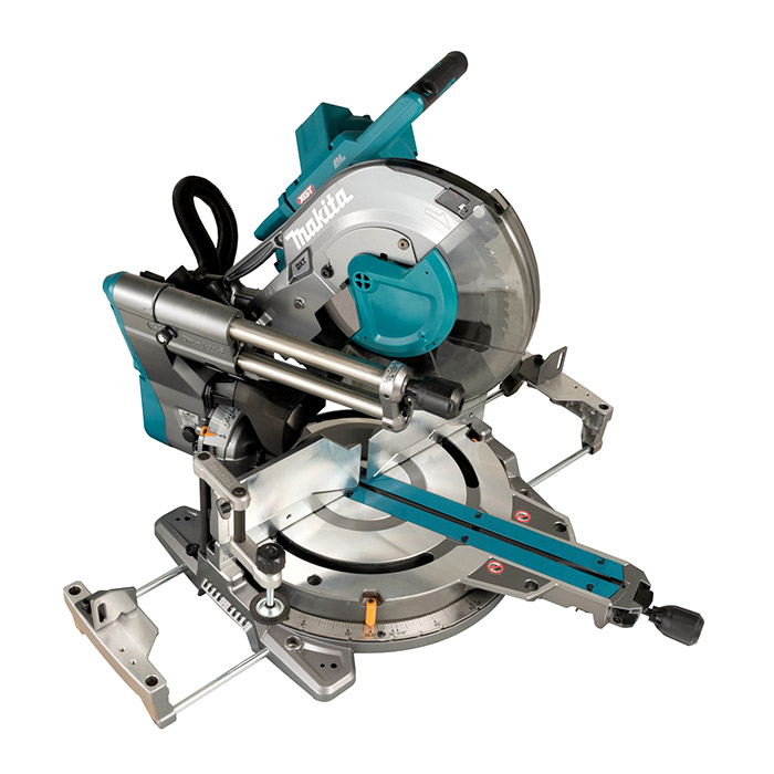 Sierra Ingletadora Telescópica Compuesta Inalámbrica BL AWS XGT de 40Vmax, 305 mm (12"), Luz LED Makita. La alta potencia entregada por el motor BL de 40Vmax permite cortar tan rápido como si estuviera usando una ingletadora telescópica compuesta con cable. Interruptor de activación de aspiradoras para mayor comodidad. La lámpara LED proyecta una sombra de la hoja de la sierra sobre la pieza de trabajo como una línea de corte exacta; Al alinear la sombra con la línea de tinta en la pieza de trabajo, puede hacer un corte exacto. El Sistema Inalámbrico de Arranque Automático (AWS) se conecta a aspiradoras compatibles con Bluetooth. Perilla frontal para un fácil ajuste del ángulo de bisel. Bloqueo de deslizamiento para bloquear el movimiento de deslizamiento del carro. El innovador sistema de caja de engranajes y guarda de transmisión directa está diseñado para una mayor capacidad de corte vertical. Freno eléctrico para máxima productividad. Incorpora la Tecnología de corte Profundo y eXacto (DXT) lograda por nuestra búsqueda constante de cortar piezas de mayor tamaño pero con mayor precisión.