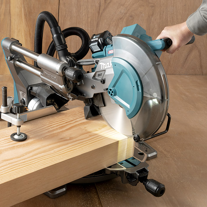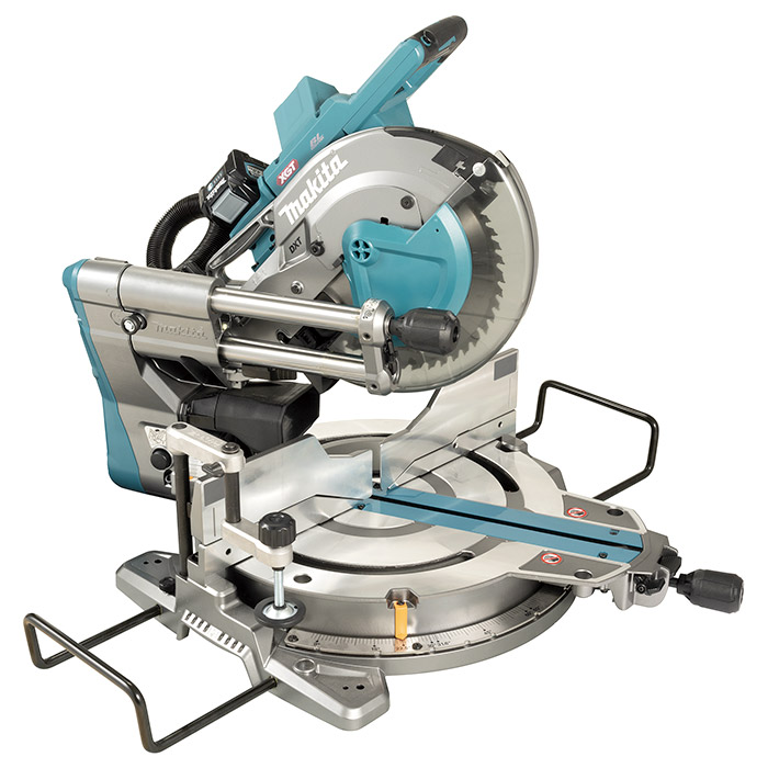 Sierra Ingletadora Telescópica Compuesta Inalámbrica BL AWS XGT de 40Vmax, 260 mm (10-1/4"), Luz LED Makita. La alta potencia entregada por el motor BL de 40Vmax permite cortar tan rápido como si estuviera usando una ingletadora telescópica compuesta con cable. Interruptor de activación de aspiradoras para mayor comodidad. La lámpara LED proyecta una sombra de la hoja de la sierra sobre la pieza de trabajo como una línea de corte exacta; Al alinear la sombra con la línea de tinta en la pieza de trabajo, puede hacer un corte exacto. El Sistema Inalámbrico de Arranque Automático (AWS) se conecta a aspiradoras compatibles con Bluetooth. Guías de tope integradas para mayor rigidez y alta precisión de corte. Bloqueo de deslizamiento para bloquear el movimiento de deslizamiento del carro. El innovador sistema de caja de engranajes y guarda de transmisión directa está diseñado para una mayor capacidad de corte vertical. Freno eléctrico para máxima productividad. Incorpora la Tecnología de corte Profundo y exacto (DXT) lograda por nuestra búsqueda constante de cortar piezas de mayor tamaño pero con mayor precisión. Llave hexagonal en la herramienta para cambios de hoja rápidos y fáciles y para evitar que se pierda. El circuito de protección de la batería protege contra sobrecarga, sobredescarga y sobrecalentamiento.