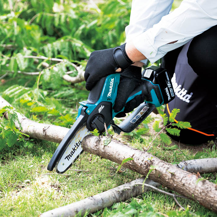 La Sierra de Poda Inalámbrica BL de 150 mm (6") y 18V LXT de Makita es un producto fácil de usar, ligero y compacto que permite podar fácilmente árboles de jardín o huerto. Nuevo cambio y ajuste de tensión de la cadena de la sierra sin herramientas, una guarda móvil que cubre la parte superior de la barra guía y una palanca de bloqueo accesible desde ambos lados.