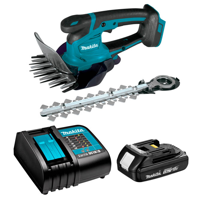 Cortasetos Inalámbrico de 11 cm (4-5/16") y 18V LXT Li-Ion, diseño ligero y compacto para un fácil manejo. Ancho de corte de 11 cm (4-5/16") para un rendimiento óptimo. recubrimiento más efectivo. Mango de diseño ergonómico con agarre seguro que proporciona más control y comodidad. La acción de doble cuchilla corta rápidamente con un efecto de cizallamiento. 2 en 1: se pueden acoplar tanto la cuchilla de recortadora como la de cizalla. La altura de corte es ajustable en 3 etapas para adaptarse a la aplicación para un corte suave y consistente. El sistema de cambio de cuchilla sin herramientas permite cambios simples y fáciles.