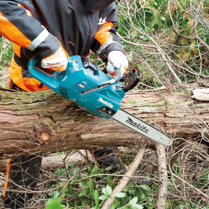 Motosierra Inalámbrica sin Escobillas (Brushless) BL XGT de 40Vmax, 45 cm (18"). Excelente rendimiento de corte equivalente a las motosierras a motor de clase 42mL para una tala suave de árboles con un diámetro de tronco de aproximadamente 300mm. Interruptor de encendido principal con función de apagado automático para ahorrar batería y evitar el arranque involuntario. Lubricación automática de la cadena ajustable con gran depósito de aceite. Freno mecánico y freno eléctrico para máxima productividad.